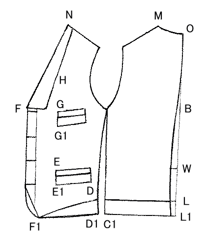 | 【考案の名称】貴重品収納衿付きベスト 【実用新案権者】 【識別番号】502380796 【氏名又は名称】富家 正道 【住所又は居所】東京都江戸川区船堀6丁目4番23号 【考案者】 【氏名】富家 正道 【住所又は居所】東京都江戸川区船堀6丁目4番23号 【要約】(修正有) 【課題】 ポケットに印鑑、パスポート、通帳、保険証等貴重品を安全に収納でき盗難、落下を防止するベストを提供する。 【解決手段】 ベストの着丈を3センチ長くして、前身頃のカットを無くしポケットの深さを確保し、さらに箱ポケットに、蓋を付けその蓋を利用し上方に展開させてボタン止めすることで、貴重品を安全に身に付けて持ち歩く事が出来、盗難防止にも役立つ。 【実用新案登録請求の範囲】 【請求項1】 ベストに作り付け衿を採用し腰ポケット胸ポケットに箱ポケット蓋付き上方釦止めとした事を特徴とする貴重品収納衿付きベスト。 【考案の詳細な説明】 【技術分野】 本考案は老若男女を問わず、身体が不自由になった人にもセカンドバック代替用に関するするものである。 【背景技術】 従来、ベストは、スーツの中に着用するもので、貴重品を入れてもポケットが浅くて落としてしまう危険性がありこれとは、別に新しい、人が誰でも着用できるベストを考案する事にした。 【先行技術文献】 【特許文献】 【特許文献1】 【非特許文献】 【非特許文献1】 防弾ベストアメリカ合衆国司法省の国家司法研究所の規格 【考案の概要】 【考案が解決しようとする課題】 ポケットの深さを確保する為に、従来より着丈を長めに設定する事と箱ポケットに蓋を付けその蓋を上方に釦止めにして貴重品を落とさなくすることである。 【課題を解決するための手段】 本考案は、着丈を長くする為に製図2のL〜L1を3センチ繰り下げ、同D〜D1も3センチ繰り下げてF1〜D1を結びポケットの深さを確保する。 E〜E1は、腰箱ポケット蓋幅5センチ、G〜G1は胸箱ポケット蓋幅4センチにしその蓋を上に展開しボタンで止めることで、貴重品の安全が保たれ問題点を解決している。 【考案の効果】 以上の説明から明らかなように、本考案にあっては、次に列挙するような効果がある (1)ベストを着用したまま貴重品を収納出来る。 (2)非常時など着用したまま避難できる。 【考案を実施するための形態】 [図1]は、ベストの例を概略的に示す。図1を参照に説明する。「右」、「左」の用語は説明上、着用状態における、着用者を基準にする。 したがって、1は身頃の左側 2は身頃の右側 3は作り付け衿 4は箱腰ポケット展開図 5は箱胸ポケット展開図。 [図1]の様に4〜5〜6は、ポケットの蓋を上方に展開した図である3は作り付け衿で、7が、衿止まりで、この個所をテケポケットとして利用する。 【実施例】 [図2]の L〜L1着丈3センチ長くしL1〜C〜C1直線で結び背身頃の着丈を決め、前身頃D〜D1 3センチにして背身頃に合せる。さらに、前身頃裾線をF〜F1〜D1とカーブで結ぶ事でE=前身頃裾線のポケットの深さを確保することが出来る、さらに作り付け衿とした事でテケポケットを確保する事が出来た。 本考案の一実施例は上述の如き構成からなるものであるから、普通にベストとして着用されても良いが、貴重品収納時には、[図1]の平面図の様に4〜5〜6の様にポケットの蓋を上方に展開して釦止めとする。 【図面の簡単な説明】 【図1】本考案の平面正面図 【図2】ベストの製図 【符号の説明】 1〜左前身頃 2〜右前身頃 3〜作り付け衿 4〜左腰ポケット蓋上方展開図 5〜胸ポケット蓋上方展開図 6〜右腰ポケット蓋上方展開図 7〜テケポケット (製図記号) O〜背身頃中心 B〜バスと線 W〜ウェスト線 L〜着丈 L1〜補正 着丈 M〜衿みつ N〜ネック F〜フロント F1〜前カット D1〜補正前脇 E〜E!〜箱ポケット蓋 G〜G!〜胸ポケット蓋 |