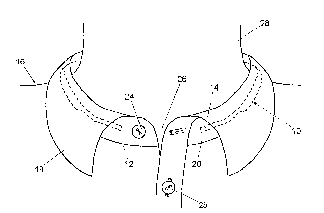 | 【考案の名称】シャツの襟元安定化構造及び襟元形状保持具 【実用新案権者】 【識別番号】502074219 【氏名又は名称】鈴木 誉四男 【住所又は居所】茨城県取手市椚木2500−5 【代理人】 【識別番号】100096002 【弁理士】 【氏名又は名称】奥田 弘之 【代理人】 【識別番号】100091650 【弁理士】 【氏名又は名称】奥田 規之 【考案者】 【氏名】鈴木 誉四男 【住所又は居所】茨城県取手市椚木2500−5 【要約】 【課題】ワイシャツ等に襟元形状保持具を装着した後に、その位置ずれや脱落が生じることがなく、しかもワイシャツの高級感を損なうこともない、襟元形状の安定化構造を提供する。 【解決手段】一対の端部(左端部12及び右端部14)を有する湾曲形状を備えた弾性部材よりなる襟元形状保持具10と、羽根襟18と台襟20を備えたワイシャツ16とからなり、台襟20が表布と裏布を重ね合わせた二重構造を備えており、台襟20の表側に一対の導入口22, 22が設けられており、襟元形状保持具10の両端部を各導入口22, 22から台襟20の内部に挿入させることにより、襟元形状保持具10とワイシャツ16との係合が完了するシャツの襟元安定化構造。 【実用新案登録請求の範囲】 【請求項1】 一対の端部を有する湾曲形状を備えた弾性部材よりなる襟元形状保持具と、 羽根襟と台襟を備えたシャツとからなり、 上記台襟が表布と裏布を重ね合わせた二重構造を備えており、 当該台襟側に一対の導入口が設けられており、 上記襟元形状保持具の両端部を、各導入口から台襟内部に挿入させることにより、襟元形状保持具とシャツとの係合状態が実現することを特徴とするシャツの襟元安定化構造。 【請求項2】 上記襟元形状保持具の表面に、1または複数の開口部が形成されていることを特徴とする請求項1に記載のシャツの襟元安定化構造。 【請求項3】 上記襟元形状保持具の表面に、1または複数の凹部が形成されていることを特徴とする請求項1または2に記載のシャツの襟元安定化構造。 【請求項4】 羽根襟と、表布と裏布を重ね合わせた二重構造の台襟とを備えたシャツに装着される襟元形状保持具であって、 一対の端部を有する湾曲形状を備えた弾性部材よりなり、 各端部を、上記台襟側に設けられた一対の導入口から台襟内部に挿入させることにより、上記シャツに係合されることを特徴とする襟元形状保持具。 【請求項5】 表面に1または複数の開口部が形成されていることを特徴とする請求項4に記載の襟元形状保持具。 【請求項6】 表面に1または複数の凹部が形成されていることを特徴とする請求項4または5に記載の襟元形状保持具。 【考案の詳細な説明】 【技術分野】 この考案は、シャツの襟元形状を安定化させる技術に係り、特に、ワイシャツなどのように台襟と羽根襟を備えたシャツにおいて、ネクタイを締めたり第1ボタンを留めたりしなくても、襟元の開口状態を自然な形で安定化させ得る技術に関する。 【背景技術】 昨今の省エネ意識の高まりに従い、ビジネスの現場でもネクタイを締めずにワイシャツの第1ボタンを外す装いが一般化してきている。これにより、ワイシャツの襟元に換気用の隙間が形成される結果、冷房の設定温度を若干高めても涼しさを保つことが可能となる。 ただし、ワイシャツの羽根襟は第1ボタンを外した状態で左右のバランスを維持することが構造上難しく、かなり糊を効かせた状態にしても、左右の羽根襟の位置が不揃いになったり、開口幅が必要以上に広がったりするため、相手に見苦しい印象を与えてしまう点が指摘されていた。 このワイシャツの襟元形状が安定化しないという問題に対処するために、これまでも数々の提案がなされていている。 例えば、特許文献1においては、薄板の直線側の長辺部に可撓性を備えた金属棒を取り付けた襟立てカラーを、ワイシャツの台襟と羽根襟との間に装着することにより、襟元の形状を安定化させるアイディアが開示されている。 また、特許文献2においては、可撓性を備えた金属棒に複数の面ファスナー切片を取り付けておき、これをワイシャツの台襟に設けておいた面ファスナーに固着させることにより、襟元の形状を安定化させるアイディアが開示されている。 【特許文献1】特開2003−138414 【特許文献2】特開2007−016344 【考案の開示】 【考案が解決しようとする課題】 しかしながら、特許文献1の襟立てカラーの場合には、ワイシャツとの接合構造を備えていないため、着用者の動きによって位置ずれや脱落が生じやすいという欠点があった。 これに対し、特許文献2の襟立てカラーの場合には面ファスナーを介してワイシャツ側に強固に固定されるため、位置ずれや脱落が生じにくい反面、複数組の面ファスナー切片同士を一々接合していく手間を要するという欠点があった。また、面ファスナーを用いることで、利用者に安っぽさを感じさせてしまうという問題もあった。 この考案は、このような問題を解決するために案出されたものであり、