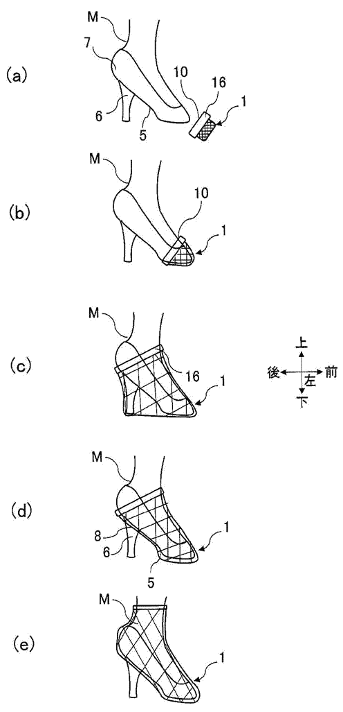 | 【発明の名称】使い捨て用履物カバー 【特許権者】 【識別番号】721001982 【氏名又は名称】山田 栄子 【住所又は居所】神奈川県横浜市鶴見区鶴見中央3丁目2番16 【代理人】 【識別番号】110003096 【氏名又は名称】特許業務法人第一テクニカル国際特許事務所 【発明者】 【氏名】山田 栄子 【住所又は居所】神奈川県横浜市鶴見区鶴見中央3丁目2番16 【要約】 【課題】履物の種類によらず各履物の外周形状に沿ってぴったりフィットし、雨水の侵入をガードする。 【解決手段】 伸縮性素材2により開口部10を備えた袋状に構成され、伸縮性素材2は、ゴム材3と、複数のメッシュ空間9が格子状に配列されたネット材4とを含み、底面5の突起部6による伸縮性素材2の破断が生じ得る第2履物7の外周側に被せ、第2履物7の突起部6で伸縮性素材2の適宜の位置を破断して、突起部6を使い捨て用履物カバー1外に現出させる貫通孔8を孔設しつつ、開口部10を使用者Mの足首にフィットさせる第2使用態様において、第2履物7の突起部6により孔設された貫通孔8の孔径の広がりを、ネット材4のうち、第2履物7の突起部6が貫入した1つのメッシュ空間9の外縁部位11によって食い止める使い捨て用履物カバー1。 【選択図】図1 ![]() |