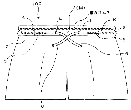 | 【発明の名称】腰回り部分の締め付け調整部を備えた衣類 【特許権者】 【識別番号】500061969 【氏名又は名称】水戸 康男 【住所又は居所】岐阜県岐阜市茜部辰新1丁目49番地 【代理人】 【弁理士】 【識別番号】100083932 【氏名又は名称】廣江 武典 【発明者】 【氏名】水戸 康男 【住所又は居所】岐阜県岐阜市茜部辰新1丁目49番地 【特許請求の範囲】 【請求項1】 腰回り部分の締め付け調整部を備えた衣類であって、前記調整部は、少なくとも長さ方向2箇所で固着されて前記腰回り部分の一部を除く位置に配設された第1ゴムと、前記腰回り部分に基端部側のみが固着されて前記第1ゴムの配設されていない位置に又は前記第1ゴムの配設されていない位置を挟んで配設された左右一対の第2ゴムとを備え、該第2ゴムの自由端部相互の結び位置を調整することにより腰回り部分の締め付け調整を行うことを特徴とする、腰回り部分の締め付け調整部を備えた衣類。 【請求項2】 腰回り部分の締め付け調整部を備えた衣類であって、前記調整部は、腰回り部分の全周にわたり配設された第1ゴムと、前記腰回り部分に基端部側のみが固着されて配設された左右一対の第2ゴムとを備え、該第2ゴムの自由端部相互の結び位置を調整することにより腰回り部分の締め付け調整を行うことを特徴とする、腰回り部分の締め付け調整部を備えた衣類。 【請求項3】 第2ゴムの自由端側に紐を取り付けて、該紐相互の結び位置を調整することにより腰回り部分の締め付け調整を行うことを特徴とする、前記請求項1又は2記載の腰回り部分の締め付け調整部を備えた衣類。 【請求項4】 第1ゴムと第2ゴムとの弾力度が異なることを特徴とする、請求項1乃至請求項3の何れか1項に記載の腰回り部分の締め付け調整部を備えた衣類。 【発明の詳細な説明】 【発明の属する技術分野】 本発明は腰回り部分の締め付け調整部を備えた衣類に係り、特にはトランクス、ブリーフ、ショーツ、パンティ、ズボン下、ズボン、スカート、パジャマ、トレーニングパンツ等のウエスト部締め付け調整が自由に行えて圧迫感を軽減させることができる衣類に関するものである。 【従来の技術】 従来、トランクス、パンティ、ズボン下、スカート、トレーニングパンツ等の腰回りに関しては、そのウエスト部分にゴム通し部を設け、これに平ゴムや丸ゴム或いはこれらのゴム束を挿通して伸縮自在な締め付け部を形成することにより、着脱の便宜及び着用時のズリ下がり防止を確保するのが一般的であった。 これらの場合、1特開平10−001802号公報においては、さらにゴム紐の抜け落ちを防止し且つ容易にゴム紐の長さを調整することができるように、2列のゴム通しを設ける技術が開示されている。 またゴムと紐とを組み合わせた技術も見受けられ、2実公昭63−2409号公報には、胴回りに密着する環状ゴムに、胴回りの締め付け具合を調整するための紐を移動可能なように並列させて取り付けた衣類が提案されている。3実開昭60−49109号公報においては、後身頃部分の通し穴に配設される少なくとも1本のゴムテープ(ゴム紐)と前身頃部分の通し穴に配設される1対の紐又はベルトとを設けたウエストフリーサイズ形スカートが提案されている。さらに4実用新案登録第3000340号公報においては、ウエスト部分の左右両脇範囲にゴム紐を設け、これらゴム紐の前端位置に紐を取付けるとともにこの紐を筒状部(紐通し部)に挿通して前部から所要長さ分突出させ、この紐を体の前方で縛るようにした下衣も提案されている。 しかしながら、前述した「ウエスト部分にゴム通し部を設けて平ゴムや丸ゴム等を挿通する」古くからの衣類は、1本(或いは複数本の)のゴムがウエスト部分全周に一体的に連続した状態で、例えば衣類に縫着されることなく或いは適宜間隔で衣類に縫着されて環状配置されており、しかも当該ゴムの引張力や伸長範囲(収縮度や弾力度)はゴム全体を通じて一定である。従って、この環状ゴムの伸長範囲内において衣類の着脱は可能であるものの、衣類を着用した際、予め挿通されたゴムの引張力(収縮度)が大きい衣類は、当初は適度な締め付け具合であったとしても強いゴムの引張力によって時間が経つに連れ締め付けがきつくなり、徐々にウエスト部分が苦しくなる。逆にゴムの引張力が小さい衣類はそもそも締め付けが緩いのであるから、或いは使用頻度が増すに連れゴムが伸びるために衣類がズリ下がるといった不具合が生じている。たしかに市販されている既製品の腰回り寸法は、衣類のサイズ(S、M、L、LL)によって何cm〜何cm等の 基準で区分され、ゴムの長さや弾力度はこれら各サイズ内で種々違えて採用されているものの、個々の製品に予め取り付けられた個別ゴムの引張力、伸長範囲は品質劣化の場合を除き変化しないのであるから、腰回りの締め付け具合の調整や修正は、ゴムを取り替えない限り、或いは環状ゴムの一定幅を束ねて結び全体長さを短く(締め付け