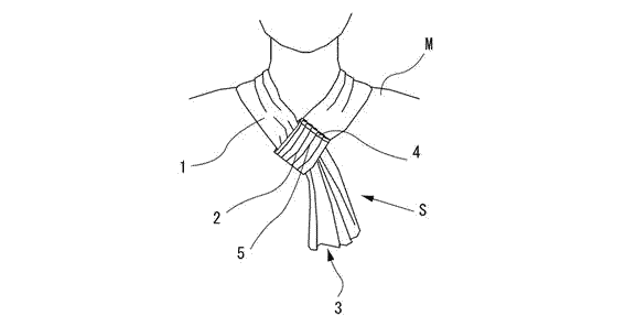 | 【発明の名称】衣服着用補助具を兼ねたスカーフ 【出願人】 【識別番号】507099284 【氏名又は名称】西山 美香 【住所又は居所】熊本県熊本市楡木2丁目11番71号 【代理人】 【弁理士】 【識別番号】100085327 【氏名又は名称】梶原 克彦 【発明者】 【氏名】西山 美香 【住所又は居所】熊本県熊本市楡木2丁目11番71号 【要約】 【課題】 腕や肩のスムーズな動作が難しい年配の人や身体面でのハンディキャップを持つ人でも、装着が簡単にできると共に、ジャケットなど袖のある衣服の着用をスムーズに行うことができるようにする補助具としての使用が可能なスカーフを提供する。 【解決手段】 スカーフSは表面が滑らかな素材で形成されている。スカーフSは、一端部に開口部3が設けられ他端部は閉塞された管状のスカーフ本体1と、スカーフ本体1の閉塞側に設けられた輪部2を備えている。スカーフ本体1は輪部2に通すことができる。スカーフ本体1と輪部2には、装飾のための重ね折り部5が設けられている。 【特許請求の範囲】 【請求項1】 少なくとも表面側が滑らかな素材で形成されており、一端側が開口され他端側が閉塞された管状または筒状で補助具としての使用時に腕の挿入が可能なスカーフ本体(1)と、 該スカーフ本体(1)の閉塞側に設けられ、スカーフ本体(1)を挿通または固定できる要素(2)と、 を備えている、衣服着用補助具を兼ねたスカーフ。 【請求項2】 スカーフ本体(1)またはスカーフ本体(1)を挿通または固定できる要素(2)に、装飾のための重ね折り部(5)が設けられている、 請求項1の衣服着用補助具を兼ねたスカーフ。 【請求項3】 スカーフ本体(1)の長さが、少なくとも400mmである、 請求項1または2の衣服着用補助具を兼ねたスカーフ。 【発明の詳細な説明】 【技術分野】 本発明は、衣服着用補助具を兼ねたスカーフに関するものである。更に詳しくは、例えば腕や肩のスムーズな動作が難しい年配の人や身体面でのハンディキャップを持つ人でも、装着が簡単にできると共に、ジャケットなど袖のある衣服の着用をスムーズに行うことができるようにする衣服着用補助具としても使用できるようにしたスカーフに関する。 【背景技術】 スカーフは、例えばシフォン(比較的粗めに織った平織り)、デシン(比較的薄地の広幅縮緬(ちりめん))、ツイル(綾織)、サテン(朱子織)などの各種素材を使用し、様々な風合いでつくられており、バイアス折り、三角折り、プリーツ折りなどの折り方と、巻き方をいろいろに変えることにより、衣服とコーディネイトしてお洒落を楽しむことができるものである。近年では、若い人たちばかりでなく、むしろ年配の人たちがお洒落を楽しんでいる傾向もみられ、スカーフを使用したお洒落も例外ではない。 しかしながら、年配の人たちにとって、スカーフをいろいろに折ったり巻いたりすることは不得手な場合も多い。一方で、年配の人たちは、一般に肩や腕の筋肉や関節が固くなっている傾向があり、コーディネイトする際にジャケットなど袖のある衣服を着用するときに、肘が衣服の肩部の袖穴口に引っ掛かったりして、腕を袖に通しにくく、スムーズに着用できない場合もある。また、身体面でのハンディキャップを持つ人たちの中には、年配の人たちと同様に、袖のある衣服をスムーズに着用することが困難な人もいる。 なお、衣服の袖や足など、衣服の細い部分に手足を通すときに、それをスムーズに行うことができるように補助するものとしては、例えば特許文献1記載の補助具がある。 この補助具は、ポリフッ化エチレンシートで一方を開口した袋体に構成され、袋体に手または足を入れてウエットスーツの袖口あるいは足首口を通してから袋体を外してウエットスーツを着用することができ、表裏面で摩擦係数が異なり、表面側が小摩擦係数となるよう形成されており、ウエットスーツへの手足の挿入が、手足を痛めることなく、慣れない使用者であっても容易に行うことができるというものである。 【特許文献1】 実用新案登録第3103338号 【発明の開示】 【発明が解決しようとする課題】 前記したように、年配の人たちや身体面でのハンディキャップを持つ人たちにとって、スカーフをいろいろに折ったり巻いたりすることは不得手な場合も多いために、従来の一般的なスカーフは、手軽にお洒落を楽しむには、やや使いにくい面もあった。 一方で、年配の人たちや身体面でのハンディキャップを持つ人たちにとっては、お洒落を楽しむために、例えばジャケットなど袖のある衣服を着用する際にも、人によっては着用をスムーズに行うことができないというもどかしさも少なからずあった。 そこで、本発明の目的は、腕や肩のスムーズな動作が難しい年配の人や身体面でのハンディキャップを持つ人でも、スカーフの巻き付けが簡単にできるようにすることである。 また、本発明の他の目的は、前記目的に加えて、腕や肩のスムーズな動作が難しい年配の人や身体面で