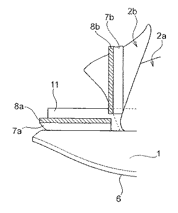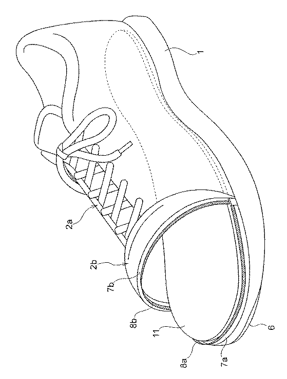 | 【発明の名称】シューズ 【権利譲渡・実施許諾】特許権者において、権利譲渡・実施許諾の用意がある。 【早期審査対象出願】 【特許権者】 【識別番号】515244900 【氏名又は名称】広田 貴彦 【住所又は居所】茨城県つくば市森の里10-2 【発明者】 【氏名】広田 貴彦 【住所又は居所】茨城県つくば市森の里10-2 【要約】 【課題】 装着者の疲労を抑え、より速い走行又は歩行が可能になるシューズを提供する。 【解決手段】 シューズは、ミッドソール1の上に設けられミッドソール1との間に足指を収納する内部空間を形成するアッパー(2a,2b)と、を備えるシューズであって、アッパー(2a,2b)は、1に固定されたアッパー本体2aと、アッパー本体2aの足指側の端部に連結され、連結された部分を中心にアッパー本体2aに近接するように自在に回転する可動爪先部2bと、アッパー本体2a及び可動爪先部2bのそれぞれの表面上に対をなして設けられた固定装置(3a〜5a,3b〜5b)と、を備え、可動爪先部2bの回転によって内部空間の爪先側の領域を開放し、固定装置(3a〜5a,3b〜5b)によって回転した可動爪先部2bをアッパー本体2aの外表面上に固定して、爪先側の領域の開放状態を保持する。 【選択図】図8 ![]() 【特許請求の範囲】 【請求項1】 ミッドソールと、 前記ミッドソールの上に設けられ前記ミッドソールとの間に足指を収納する内部空間を形成するアッパーと、を備えるシューズであって、 前記アッパーは、 前記ミッドソールに固定されたアッパー本体と、 前記アッパー本体の前記足指側の端部に連結され、前記連結された部分を中心に前記アッパー本体に近接するように自在に回転する可動爪先部と、 前記アッパー本体及び前記可動爪先部のそれぞれの表面上に対をなして設けられた固定装置と、を備え、 前記可動爪先部の回転によって前記内部空間の爪先側の領域を開放し、 回転した前記可動爪先部を前記固定装置によって前記アッパー本体の外表面上に固定して、前記爪先側の領域の開放状態を保持することを特徴とするシューズ。 【請求項2】 前記可動爪先部の位置を前記ミッドソール上の先端で前記アッパー本体と外表面同士を揃えて固定することにより前記内部空間を閉鎖する状態と、前記可動爪先部を前記ミッドソールから分離するように回転させて前記内部空間を開放する状態とを切り換える開閉機構を更に備えることを特徴とする請求項1に記載のシューズ。 【請求項3】 前記開閉機構はスライドファスナーであり、 前記ミッドソールの上で前記内部空間に配置されるインソールを更に備え、 前記スライドファスナーの下側エレメント群は、前記インソールの上面より低く配置されていることを特徴とする請求項2に記載のシューズ。 【発明の詳細な説明】 【技術分野】 【0001】 本発明はシューズ、特にランニングシューズに関する。 【背景技術】 【0002】 マラソン競技のような長距離を走る際に、装着するランナーの疲労を抑えてより速く走れるように補助可能なシューズ(短靴)が求められている。例えば特許文献1には、板バネをシューズの底に取り付けることにより、着地時の衝撃をエネルギーとして活用し、効率的な走行を可能にするシューズが開示されている。しかし特許文献1の技術であってもランナーの補助の観点からは必ずしも十分ではなく、更なる技術が求められていた。 【先行技術文献】 【特許文献】 【0003】 【特許文献1】 特開2010−162318号公報 【発明の概要】 【発明が解決しようとする課題】 【0004】 本発明は上記した問題に着目して為されたものであって、装着者の疲労を抑え、より速い走行又は歩行を可能にするシューズを提供することを目的とする。 【課題を解決するための手段】 【0005】 上記課題を解決するために、本発明に係るシューズのある態様は、ミッドソールと、ミッドソールの上に設けられミッドソールとの間に足指を収納する内部空間を形成するアッパーと、を備えるシューズであって、アッパーは、ミッドソールに固定されたアッパー本体と、アッパー本体の足指側の端部に連結され、連結された部分を中心にアッパー本体に近接するように自在に回転する可動爪先部と、アッパー本体及び可動爪先部のそれぞれの表面上に対をなして設けられた固定装置と、を備え、可動爪先部の回転によって内部空間の爪先側の領域を開放し、回転した可動爪先部を固定装置によってアッパー本体の外表面上に固定して、爪先側の領域の開放状態を保持することを要旨とする。 【発明の効果】 【0006】 よって本発明に係るシューズによれば、装着者の疲労を抑え、より速い走行又は歩行が可能になる。 【図面の簡単な説明】 【0007】 【図1】本発明の実施の形態に係る右足用のシューズの、内部空間の先端が閉鎖された状態における構成の概略を模式的に説明する斜視図である。 【図2】本発明の実施の形態に係るシューズを上面から見た図(平面図)である。 【図3】本発明の実施の形態に係るシュ