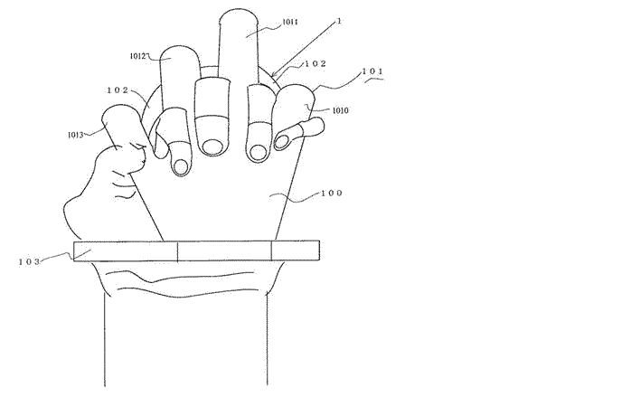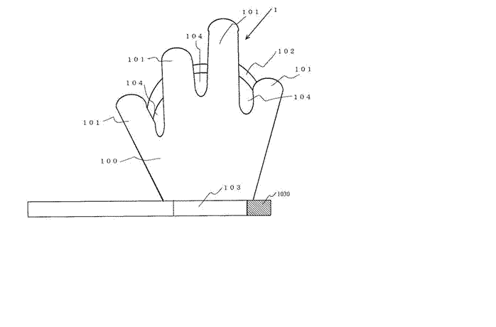 | 【考案の名称】手袋形の手の介護用品 【実用新案権者】 【識別番号】507030852 【氏名又は名称】藤本 フサ 【住所又は居所】千葉県千葉市若葉区若松台3−29−5 【代理人】 【弁理士】 【識別番号】100085039 【氏名又は名称】佐藤 良博 【考案者】 【氏名】藤本 フサ 【住所又は居所】千葉県千葉市若葉区若松台3−29−5 【要約】 【構成】 手の指と指との間に介装される介装部101と手の平に当接する当接部100と介装部101と介装部101との間に架設された架設部102と下端部に設けた手首固定バンド部103とを有してなることを特徴とする手袋形の手の介護用品1。 【効果】 脳梗塞などで手指に硬直症状を来している人に対し有効で、指と指の間が付着しそこに汗をかいたり、手の平に汗をかいたりして、手を清潔に保てなかったり、手がただれたり、手指の血の循環が悪くなったり、水虫が発生したりすることを防止でき、手袋形で、当該患者への装着が楽で、患者の手から脱れ難く、そのリハビリ効果も高い。 【実用新案登録請求の範囲】 【請求項1】 手の指と指との間に介装される介装部と手の平に当接する当接部と前記介装部と介装部との間に架設された架設部と下端部に設けた手首固定バンド部とを有してなることを特徴とする手袋形の手の介護用品。 【考案の詳細な説明】 【技術分野】 本考案は、手袋形の手の介護用品に関し、特に、脳梗塞、脳卒中などにより手の指が硬直し手が握られたままで動かせないような患者の当該手指の指間を広げたり、手の清潔を確保したり、手が動かせるようにリハビリしたりする時等に使用できる介護用品に関するものである。 【背景技術】 脳梗塞、脳卒中などで手指に硬直症状を来している人は、自分の意志で自由に手を動かすことができず、指が硬く握り締められた状態になっている。その為、指と指の間が付着しそこに汗をかいたり、手の平に汗をかいたりして、手を清潔に保てなかったり、手がただれたり、手指の血の循環が悪くなったり、水虫が発生したりする。 そこで、木炭にガ−ゼを巻いた介護具を握らせたり、手の指が入る複数の突部を有する手の平汗吸収具を手の平の中に握らせてクリップバンドで手の平に固定して使用する手の平汗吸収具が提案され(実公平7−15543号公報)、クッション本体の内部に緩衝体を入れた掌握クッションを手の平の中に握らせ、側方掛止帯で手の平に固定するものが提案され(特開2001−252341号公報)、環状固定部に指を通し、本体を手に握り親指接部が移動した時にその親指の移動を阻止できるように親指移動阻止部を設けてなる手の介護具が提案され(特開2004−358186号公報)、突出部を指の間に入れ手の平に握り部を握り込んで、バンド状部で手の平に固定するようにした保護具(特開2004−201976号公報)等が提案されている。 これら介護用品は、共通して手の平の中に握り込ませて、上記した手の清潔を保持する等の目的を果たすものである。 しかるに、脳梗塞、脳卒中などで手指に硬直症状を来している人は、自分の意志で自由に手を動かすことができず、指が硬く握り締められた状態になっているので、手の平の中に当該握り形の介護用品を握り込ませることは容易ではない。 一方、手の平に当接する塊部と隣り合う指の間に嵌入する突出部とを有し、当該塊部を手の平に当接し、隣り合う各指の間に突出部を嵌入するようにした手袋形の身障者用介護用品が提案されている(特開2004−358186号公報)。 当該手袋形の介護用品は、その突出部を指の間に介装し、その塊部を手の平に当接していればよいので、患者にとっても苦痛が軽減され、又、介護者もその患者への装着が楽である。 しかるに、当該介護用品では、その塊部は手の平に当接されいるだけで手に固定されておらず、指の間に突出部が介装されそれが唯一の手への固定手段となっているので、患者の手から脱れ易く、介護者や看護師等が何度もの装着を余儀なくされたりする。即ち、患者に装着させて、眠らせ、その間指と指の付着を防ぎ、汗を吸収させ、手の清潔を保持させる等の役目を果たさせ、次いで、朝目が覚めたときに、手や指の動きを助けようとしても、手から脱れてしまうことになり、充分な機能を果たせないことがある。 同様の手袋形の身障者用介護用品として、指状の突起の被握部とベルトとで構成された指まくらが提案されているが(特開2002−143198号公報)、当該介護用品における当該ベルトは、手の平に固定するもので、手の平に固定するだけなので、同様に、手から脱れ易いという欠点がある。 尚、手の平を覆う覆い部とリング部と固定部とを備えてなる手指間の蒸れ防止具が特開2001−271211号公報により提案されており、当該手指間の蒸れ防止具は指と指の付着を防ぎ、汗を吸収する等の上記と同様の機能を果たせなくはないが、当該手指間の蒸れ防止具は、点滴時のカテ−テルを手に固定する時に使用するもので、事実、上記の手袋形の介護用品とは異なって、