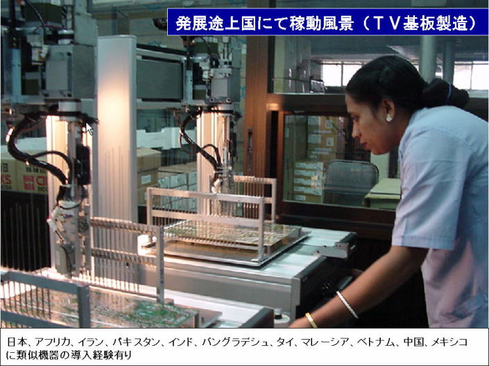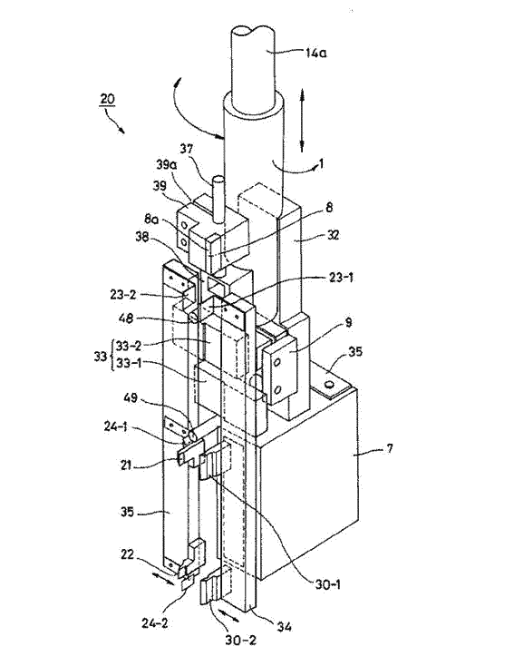 | 【発明の名称】チップ部品搭載装置 【出願人】 【識別番号】504035098 【氏名又は名称】杉山 修 【住所又は居所】神奈川県藤沢市湘南台1丁目40番12号 【代理人】 【弁理士】 【識別番号】100122884 【氏名又は名称】角田 芳末 【代理人】 【弁理士】 【識別番号】100113516 【氏名又は名称】磯山 弘信 【発明者】 【氏名】杉山 修 【住所又は居所】神奈川県藤沢市湘南台1丁目40番12号 【要約】 【課題】 簡単な構成でありながら多品種のチップ部品を配線基板に搭載することができるようにする。 【解決手段】 XYZRの4軸をもつ汎用ロボット10の載置テーブル16上に、配線基板5と、チップ部品を積み重ねて収納したマガジン40を、搭載する部品の種類だけ設けたスタンド17-1,17-2を立設する。搭載ヘッド20に設けられているバーコードリーダで、マガジン40に設けられているバーコード41aを読取って、搭載するチップ部品とスタンド17-1,17-2での配置とを対応付け、予め登録されている配線基板5の搭載部品名、部品搭載レイアウトから所定の位置に所望のチップ部品を順次搭載できるようにした。 【特許請求の範囲】 【請求項1】 部品を基板に搭載する部品搭載装置において、 前記部品の複数個が収容され、前記基板に当接した状態で前記部品の押出し棒により先端の前記部品より1個分上方に設けられた前記部品のホールドバネに抗して、前記先端に前記部品が1個ずつ略水平な姿勢で押し出されるように構成され、側面に前記部品に対応する記号が明示された部品収容体と、 前記基板に搭載する前記部品の前記部品収容体を着脱自在に支持するスタンドと、 前記部品収容体の把持機構と前記部品収容体に明示された前記部品の記号読取機構を有する搭載ヘッドと、 前記搭載ヘッドを垂直方向の昇降動作及び垂直軸周りに回転動作できるようにしたヘッド駆動機構を有し、 前記基板に対して前記ヘッド駆動機構が、略水平面上を相対的に移動できるようにした ことを特徴とする部品搭載装置。 【請求項2】 請求項1に記載の部品搭載装置において、 前記部品収容体を前記搭載ヘッドの把持機構で把持するとともに、前記部品収容体に挿入された前記部品の前記押出し棒を把持するようにし、 前記押出し棒の把持力を前記部品収容体内の部品の保持力よりも大きくなるようにし、 前記部品収容体内に前記押出し棒を把持した状態で前記搭載ヘッドを下降させ、前記部品収容体の下端が配線基板と接触したときに前記押出し棒で前記部品収容体内から前記部品を押し出すようにした ことを特徴とする部品搭載装置。 【請求項3】 請求項1又は2に記載の部品搭載装置において、 前記基板に基づいて予め設定されている、搭載される前記部品の品名及び前記部品のレイアウト情報が、 前記部品収容体に明示された前記記号から得られた前記部品の品名と照合されることにより、 前記基板上の所定位置に、所望の部品を搭載できるようにした ことを特徴とする部品搭載装置。 【請求項4】 請求項1乃至3の何れかに記載の部品搭載装置において、 前記部品収容体に明示される、前記部品の前記記号が、バーコードであり、前記部品の記号読取機構をバーコードリーダとした ことを特徴とする部品搭載装置。 【発明の詳細な説明】 【技術分野】 本発明は、複数の部品を順次対象物に対して搭載するための部品搭載装置に関する。 【背景技術】 プリント配線基板やセラミックス多層配線基板などの配線基板に搭載されるコンデンサ、抵抗、インダクタンスなどの電子部品は高密度実装などの要請から、部品サイズの小型化が著しく、例えば略直方体で一辺が最大でも2mm程度の小型形状のチップ部品が多用されている。 このようなチップ部品を配線基板に実装するための部品実装機は、世の中に出て以来、完全自動化、スピードアップ化、精密化が進んだ結果、大変高価なものになっている。そのため、簡単な配線基板に僅かのチップ部品を搭載するときも、大げさなチップ部品搭載装置を用いなければならず、中小企業におけるチップマウントオペレーションはコストの面から割に合わないため殆ど不可能となっている。 また、配線基板上に多品種で多数のチップ部品を搭載するような大規模チップマウント工場では、設備の一貫ライン化などのため、大型タンカー並みの大きさの装置を設置しており、その稼動率維持のため、頻繁な機種切り替えを余儀なくされている。そして、この切り替えの時間のため、全体的な稼動ロスは50%にもなる状況である。 一方、最近、セル生産方式という名のもとに、人がこまめに少ロットのみを作るラインが世界中の企業で展開されているが、チップが小さすぎて人手で行うには限界にきている。また、このような微小なチップを搭載できる部品搭載装置自体が高価であるため、機器の投資コストが大きく、後進国ではこの種の工業が発展しにくいものとなっている。 このようなことから、本願の発明者は先に出願済みの特許
