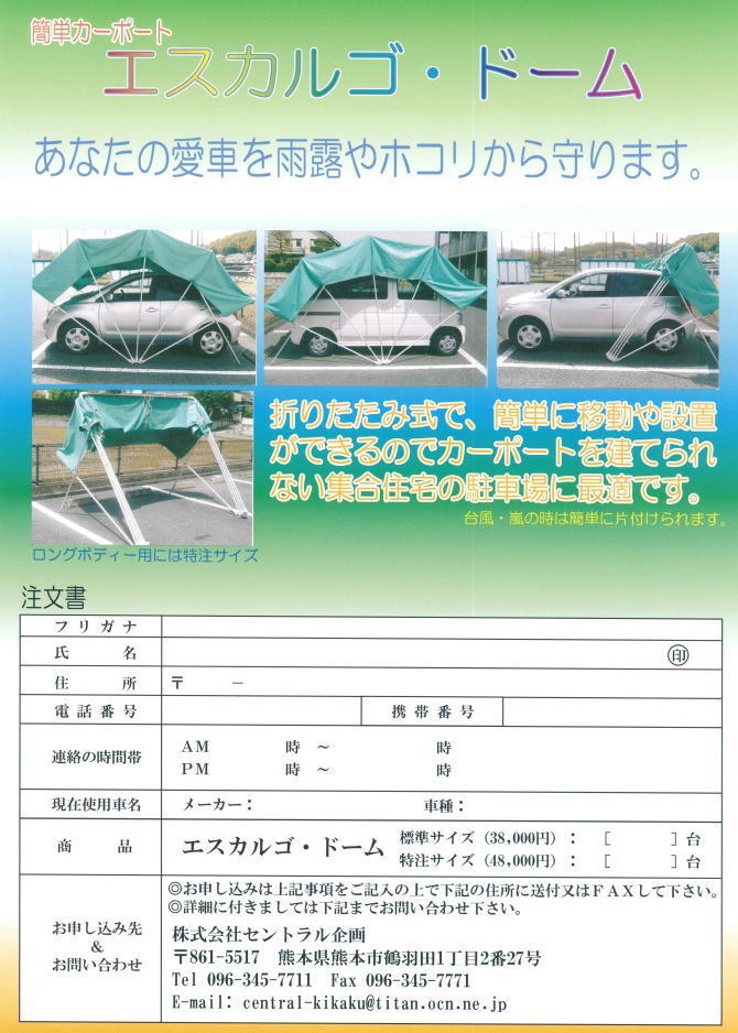 | 【考案の名称】簡易設置型車庫 【実用新案権者】 【識別番号】509322487 【氏名又は名称】清田 とく弘 【住所又は居所】熊本県熊本市鶴羽田町454−1 【代理人】 【弁理士】 【識別番号】100092163 【氏名又は名称】穴見 健策 【代理人】 【弁理士】 【識別番号】100136928 【氏名又は名称】高宮 章 【考案者】 【氏名】清田 とく弘 【住所又は居所】熊本県熊本市鶴羽田町454−1 【要約】(修正有) 【課題】 構造が簡単で低コストで製造できるとともに、設置場所が制限されることなく様々な場所に簡易に設置できる簡易設置型車庫を提供する。 【解決手段】 自動車の幅方向両側に配置される1対のベース部12と、1対のベース部12に逆U字状に架設支持され自動車Vの外周の前後方向に略扇状に展開、折り畳み自在に設けられた複数のフレーム141〜145と、複数のフレーム141〜145に張設されたカバー体16と、複数のフレーム141〜145を折り畳んで後方側に後傾して収束させた状態で支持する支持スタンド18と、を備えたことを特徴とする簡易設置型車庫10から構成される。 【実用新案登録請求の範囲】 【請求項1】 自動車の幅方向両側に配置される1対のベース部と、 1対のベース部に逆U字状に架設支持され自動車の外周の前後方向に略扇状に展開、折り畳み自在に設けられた複数のフレームと、 複数のフレームに張設されたカバー体と、 複数のフレームを折り畳んで後方側に後傾して収束させた状態で支持する支持スタンドと、を備えたことを特徴とする簡易設置型車庫。 【請求項2】 支持スタンドは、後傾して収束させた状態の複数のフレームの中の最後尾のフレームを含む1又は複数のフレームと協働して側面視で開脚接地部を形成するように上部をもたれ状態でそれらのフレームと連結される脚部材を含むことを特徴とする請求項1記載の簡易設置型車庫。 【請求項3】 脚部材は、1又は複数のフレームとX字状に交差して連結されていることを特徴とする請求項2記載の簡易設置型車庫。 【請求項4】 支持スタンドは、複数のフレームの中の最後尾のフレームを含む1又は複数のフレームに対して着脱可能に連結されたことを特徴とする請求項1ないし3のいずれかに記載の簡易設置型車庫。 【考案の詳細な説明】 【技術分野】 本考案は、簡単に設置して自動車を雨や夜露、塵芥又は日光等から保護できる簡易設置型車庫に関する。 【背景技術】 自動車を屋根の無いところに駐車すると、雨や夜露、埃、火山灰、黄砂等によりボディや窓ガラスが汚れたり、劣化したり、あるいは夏場等に直射日光が当たって車室内の温度が上昇し、ハンドル等を直接触れることができなくなったり、車内設備が故障してしまう等の問題がある。そこで、自動車を保護するために車庫やカーポート等の設備を設ける場合がある。しかしながら、従来の車庫やカーポート等は設備コストが高く、施工にも労力、時間を要するうえ、ある程度広い場所が必要であった。さらに、団地の駐車場や賃貸の月極め駐車場等の自動車1台分ずつ区画されている場合には、利用できるスペースが狭く限られており、設置するのが困難ないし不可能であった。 例えば、特許文献1には、組立・設置を簡単に行なわせるのを目的とした簡易車庫が提案されている。特許文献1の簡易車庫では、アンカーボルト4,4…で基礎の上に基盤2を固設し、基盤2に立設された二枚の支持板3,3に複数の支持フレーム1,1…が両下端を回動自在に配設され、全体をテントカバーで覆って構成されている。そして、車を車庫に入れるときは、支持フレーム1,1…の前半部を垂直に持ち上げて開口部を作り、車を入庫させた後、持ち上げた支持フレーム1,1…を下ろして側面視扇状に車を覆うようにするものであった。なお、符号は特許文献1に記載されたものである。 【先行技術文献】 【特許文献】 【特許文献1】 実用新案登録第3142957号公報 【考案の概要】 【考案が解決しようとする課題】 しかしながら、特許文献1の簡易車庫では、設置する際にコンクリート基礎上に基盤を置いてアンカーボルトを打込み固定する必要があるから、工事が煩雑で労力、コスト、時間がかかっていた。さらに、団地やマンションの駐車場、賃貸の駐車場の場合には、通常では舗装地面に孔を穿孔することが許可されないので設置することができず、設置場所が限られてしまう問題があった。さらに、簡易車庫を撤去した後に地面にアンカーボルトを打ち込んだ孔が残るので補修が必要となり、手間とコストがかかっていた。また、アンカーボルトで基盤を固定せずに簡易車庫を地面上に単に置くだけでは車庫が極めて不安定となり、実用性に劣る問題があった。 本考案は、上記従来の課題に鑑みてなされたものであり、その一つの目的は、構造が簡単で低コストで製造できるとともに、設置場所が制限されることなく様々な場所に簡易に設置できる簡易設置型車庫を提供することにある。 【課題を解決するための手段】 上記課題を解決するた