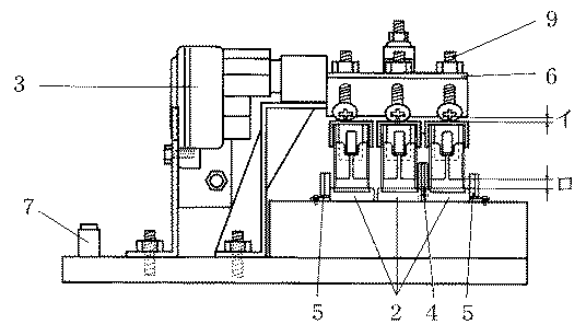 | 【考案の名称】電動連動ステープル 【実用新案権者】 【識別番号】305028671 【氏名又は名称】土岐 駿 【住所又は居所】愛知県稲沢市井之口大宮町116−3 【考案者】 【氏名】土岐 駿 【住所又は居所】愛知県稲沢市井之口大宮町116−3 【考案者】 【氏名】土岐 彩夏 【住所又は居所】愛知県稲沢市井之口大宮町116−3 【要約】 【課題】 誰でも簡単に操作でき、指、手首の疲労無く「筋肉痛、腱鞘炎」から開放され短時間で数箇所ステープルできる能率的なステープル。 【解決手段】 本考案の電動連動ステープルはステープル(2)を複数同時に作動させモーター(3)による駆動により疲労無く短時間でステープル作業ができるよう高能率化したもの。また、廃車の解体車輌のワイパーモーターを使用することによるコスト低減を図った。 【実用新案登録請求の範囲】 【請求項1】 ホッチキス取り付け台(1)上に複数配列された連動ホッチキス装置において 1つのモーター(3)でロッカーアーム(6)を介して複数のホッチキス(2)を同時に作動さすことを特徴とする電動連動ホッチキス装置。 【請求項2】 ホッチキス取り付け台(1)上に複数配列された連動ホッチキス装置において 製品(10)(図6参照)をホッチキス(2)に挿入するだけで1回の操作で同時に複数個所を自動的にホッチキスできることを特徴とする電動連動ホッチキス装置。 【請求項3】 ホッチキス取り付け台(1)上に複数配列された連動ホッチキス装置において ホッチキス(2)の中央部に設けたポジションセンサ(4)により製品を挿入しない限りホッチキス(2)が作動しない安全性を考慮したことを特長とする電動連動ホッチキス装置。 【請求項4】 ホッチキス取り付け台(1)上に複数配列された連動ホッチキス装置において 左右に設けたガイド(5)により製品(10)をホッチキス(2)に挿入するだけで所定の位置にホッチキスできホッチキスの位置不揃いによる不良品の発生防止を特徴とする電動連動ホッチキス装置。 【請求項5】 ホッチキス取り付け台(1)上に複数配列された連動ホッチキス装置において ロッカーアーム(6)の停止位置はホッチキス(2)とロッカーアーム(6)の間(図3イ部参照)に指が容易に入らないような間隙とし指の挟み込み等の危険防止を図り安全を考慮した電動連動ホッチキス。 【請求項6】 ホッチキス取り付け台(1)上に複数配列された連動ホッチキス装置において 個々のホッチキス針の押え量の不揃いを防止する為ホッチキス針の押え量を調節できるタペットスクリュー(9)を設けることによりホッチキス針の押え量不揃いによる不良品の発生を防止することを特徴とした電動連動ホッチキス。 【請求項7】 ホッチキス取り付け台(1)上に複数配列された連動ホッチキス装置において ホッチキス(2)ロッカーアーム(6)の間(図3参照 ロ部)が広すぎると製品(10)の中味がこの間に転がり込みホッチキス(2)が停止する(ロッカーアーム(6)はホッチキス針を押さえ込むまで反転しない)のを防止する為隙間を規制するホッチキス(2)の高さ調節スクリュー(8)を設けたことを特徴とする電動連動ホッチキス装置。 【請求項8】 ホッチキス取り付け台(1)上に複数配列された連動ホッチキス装置において 万一製品(10)の中味がホッチキス(2)に挟み込みモーター(3)が途中で停止した場合、製品(10)がホッチキス(2)より取り出せない。この場合モーター(3)を逆転させロッカーアーム(6)を上にあげ製品(10)を取り出せるように逆転スイッチ(7)を設けたことを特徴とする電動連動ホッチキス装置。 【考案の詳細な説明】 【技術分野】 本考案は事務用機器の分野に関するものでホッチキスは殆ど単体で存在使用されているが本考案品は事務用機器のホッチキス分野に属します。 【背景技術】 従来ホッチキスは紙、本等の綴じものに1個所づつ指で操作し個別に使用する単体使用方法が一般的である。 【特許文献1】実開昭59−183772号公報 【特許文献2】実開昭63−074284号公報 【考案の開示】 【考案が解決しようとする課題】 従来のホッチキスでは指で操作するため指、手首等に疲労が生じる。このため「筋肉痛、腱鞘炎」等から開放し身にやさしいホッチキスを開発すること。 小物包装袋(惣菜パック、玉子パック)等の場合樹脂製のケースが多く指の力を要するため指の力を不要とすること。 内職者の場合、1個の製品に3〜5箇所とホッチキス個所が多く1日に1000個〜2000個作業する場合1日に3000〜10000回のホッチキス操作を要す。短時間に(1/3〜1/5)で操作でき能率が向上すること。 誰でも簡単に操作できること。 所定の位置に確実にホッチキスできホッチキス位置不良による不良品が生じないこと。 小型で卓上で作業でき移動が容易なこと。 操作が容易で安全で危険性のないこと。 【課題を解決するための手段】 本考案の電動連動ホッチキスは指、手首等の疲労による「筋肉痛、腱鞘炎」から開放するためモーター(3)によりホッチキス(2)を駆動さすこととした。 本考案の電動連動ホッチキスは作業時間短縮、高能率化のため1つのモーター