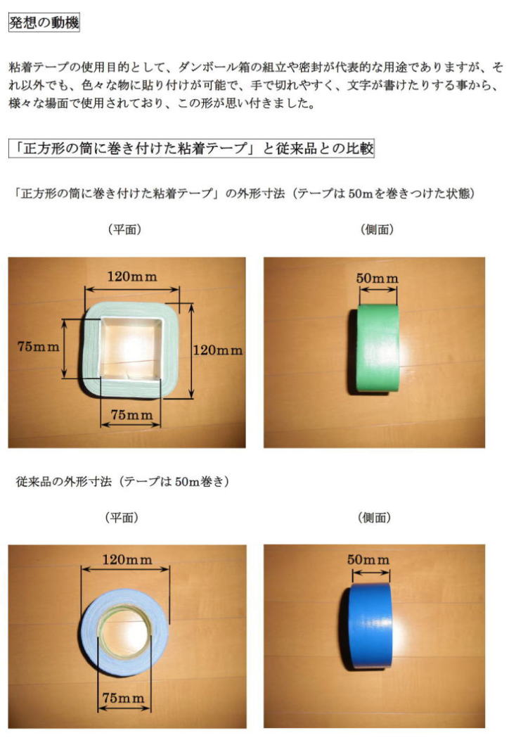| 【発明の名称】粘着テープ 【出願人】 【識別番号】515042432 【氏名又は名称】佐藤 友昭 【住所又は居所】埼玉県さいたま市大宮区寿能町2丁目22−4−1 【代理人】 【識別番号】100110766 【弁理士】 【氏名又は名称】佐川 慎悟 【住所又は居所】埼玉県さいたま市大宮区寿能町2丁目22−4−1 【代理人】 【識別番号】100133260 【弁理士】 【氏名又は名称】小林 基子 【代理人】 【識別番号】100169340 【弁理士】 【氏名又は名称】川野 陽輔 【代理人】 【識別番号】100195682 【弁理士】 【氏名又は名称】江部 陽子 【発明者】 【氏名】佐藤 友昭 【要約】 【課題】保管時は見た目も綺麗に安定して保管することができ、使用時には文字を書くことや適当な長さで切り取り易く、実用性の高い粘着テープを提供する。 【解決手段】4つの角部21が所定の曲率半径Rを有する角丸に形成された芯材2の外周面22に、粘着テープ材3が巻回されて構成されている。また、前記芯材2の角部21外形の曲率半径Rが0.5mm以上15mm以下に形成されていてもよい。さらに、前記芯材2の内径Lが一辺30mm以上100mm以下であって、幅Wが20mm以上100mm以下に形成されていてもよい。 【選択図】 図1 ![]() 【特許請求の範囲】 【請求項1】 4つの角部が所定の曲率半径を有する角丸に形成された略正方形環状の芯材の外周面に、粘着テープ材が巻回されている粘着テープ。 【請求項2】 前記芯材の角部外形の曲率半径が0.5mm以上15mm以下に形成されている、請求項1に記載の粘着テープ。 【請求項3】 前記芯材の内径が一辺30mm以上100mm以下であって、幅が20mm以上100mm以下に形成されている、請求項1または請求項2に記載の粘着テープ。 【発明の詳細な説明】 【技術分野】 【0001】 本発明は、粘着テープに関し、特に粘着テープ材の表面に文字を書いて使用したり、短めの長さで使用する際に好適な粘着テープに関するものである。 【背景技術】 【0002】 市販されている一般的な粘着テープは、紙やプラスチック製の円環状の芯材に、紙や布、フィルム等のテープ基材が巻回されており、その用途は、段ボール箱の組み立てや梱包、目留め、仮留め、補修の他、手でも切りやすく外周面に文字が書けることから作業現場における作業道具や倉庫における保管箱にメモ書き等としても使用されることが多く、極めて多岐にわたる。 【0003】 一方、上述したような円環状に形成された粘着テープ類は、その内側に円筒状の大きな空間を有し、厚さ、大きさなどの点から携帯上不便であり、保管効率や輸送効率が悪いという問題が指摘されていた。これらの問題を解決するため、従来、略扁平状に形成された比較的肉厚の薄い芯材の外周面に粘着テープ材が巻回された粘着テープが提案されている。 【0004】 例えば、特開平9−255926号公報には、長径が140mm以下で、この長径に対する短径の比率が50パーセント以下の楕円状または楕円状に変形可能な芯材に、粘着テープ材が巻回されてなる粘着テープが開示されている(特許文献1)。この特許文献1の発明によれば、扁平な形状に変形させることができるため、持ち運びに便利であり、収納スペースも取らないという効果があると記載されている。 【0005】 また、特開2000−136364号公報には、厚さが10〜100μmのシート状材料からなる略扁平状の環状体の外周面に粘着面を内側にして粘着テープが巻回されていることを特徴とする巻回粘着テープが開示されている(特許文献2)。この特許文献2の発明によれば、略扁平状の環状体が薄いシート状材料から構成されて変形しやすいため、保管や携行の際には扁平に潰し、使用時には環状体の内側に指を差し入れることができて携帯上かつ使用上便利であり、保管効率および輸送効率の点で優れていると記載されている。 【先行技術文献】 【特許文献】 【0006】 【特許文献1】特開平9−255926号公報 【特許文献2】特開2000−136364号公報 【発明の概要】 【発明が解決しようとする課題】 【0007】 しかしながら、従来の円環状に形成された芯材に巻回された粘着テープの場合、転がり落ちやすいため、すぐに使える場所に置きにくく、戸棚や引き出しに収納しなければならない。また、メモ書きとして使用する場合、曲面なので文字が書きにくいという問題がある。 【0008】 また、特許文献1および特許文献2に記載された発明においては、保管時や輸送時には扁平な形状に変形されて搬送されるが、使用時には扁平環状体を拡大されて円形に近い楕円形状にて使用されるため、転がりやすい形状になっている。また、保管時には扁平につぶされ、使用時には円形乃至楕円形状に拡大されることを繰り返すため、粘着テープが歪んだ形状になってしまい、文字が書きにくくなるし、適当な長さで千切ることもしにくくなるという問題がある。さらに、見た目が悪いので、文房具としての魅力が激減してしまう。 【0009】 本発明は、このような問題点を解決するためになされたものであって、保管時は見た目も綺麗に安定して保管する